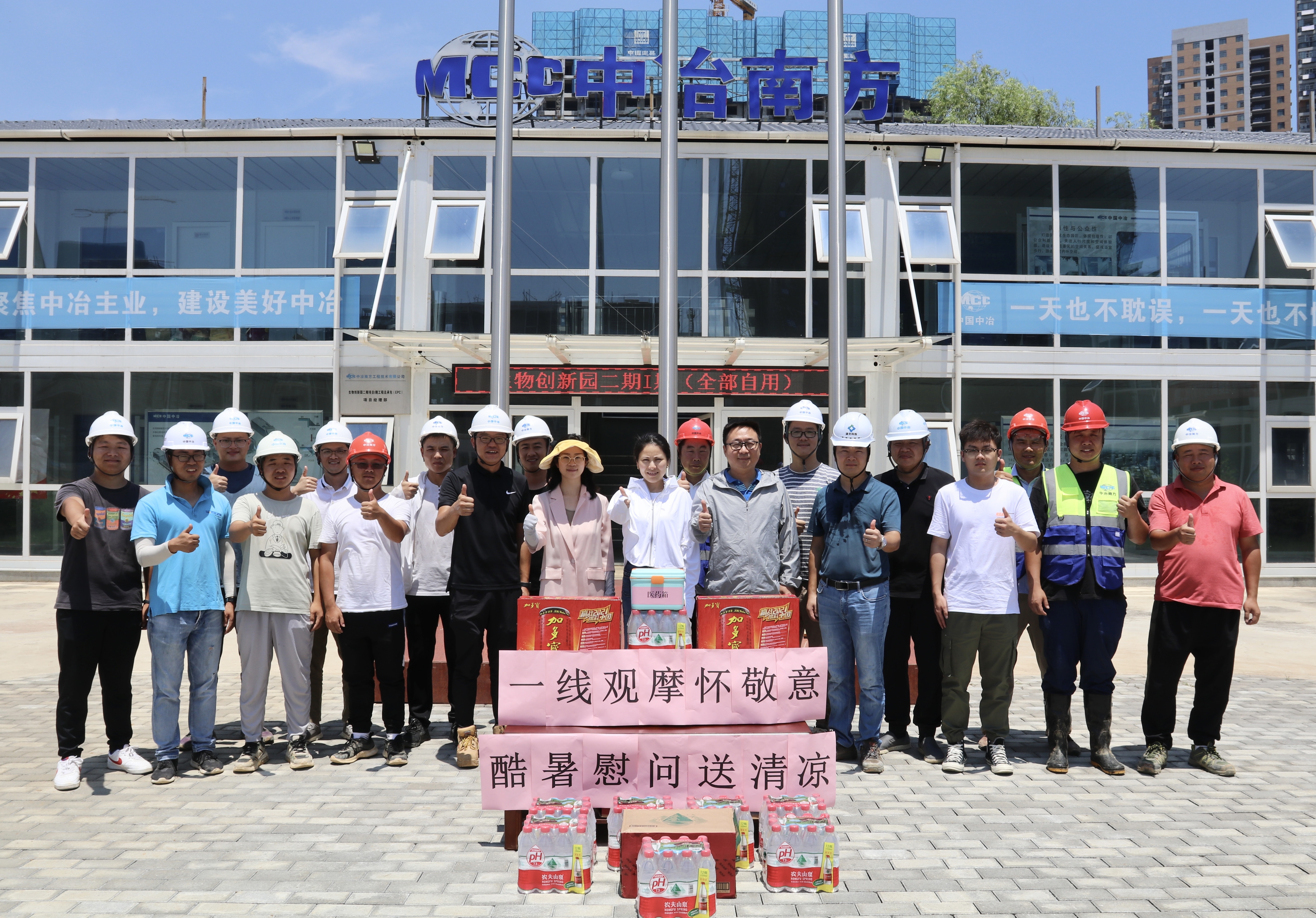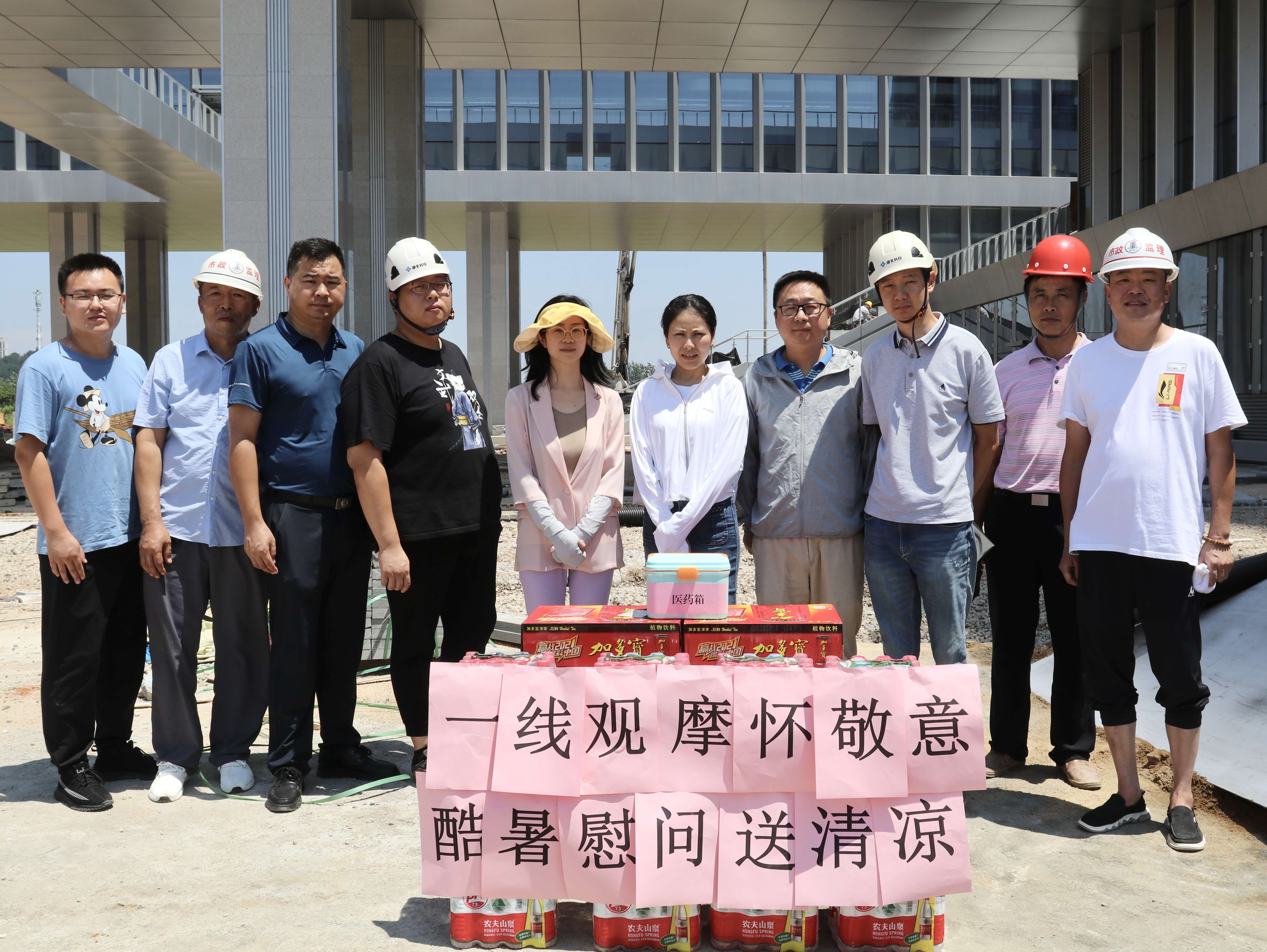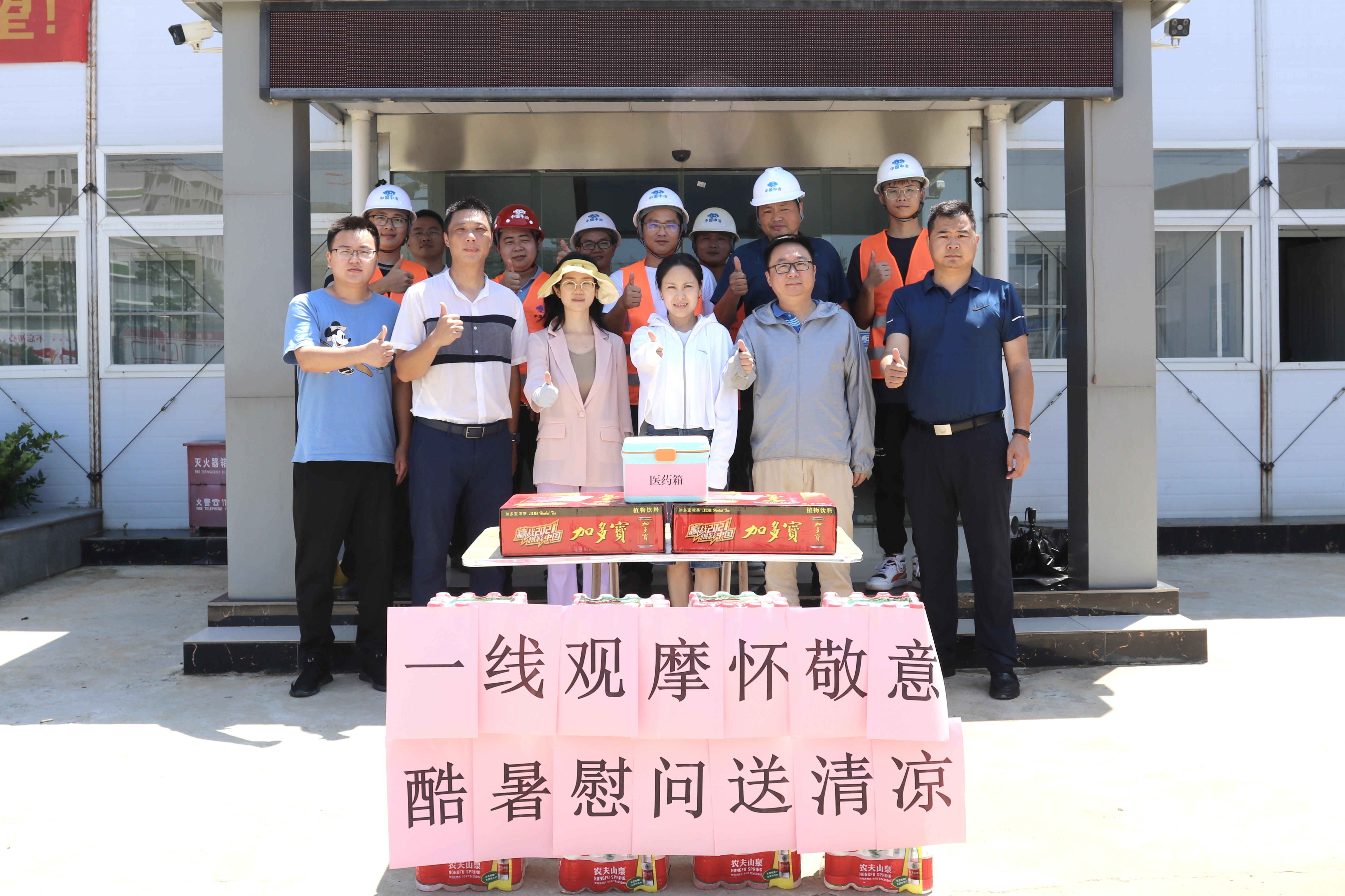 整潔衛(wèi)生的施工場地、醒目的標語標識牌、文明安全的施工氛圍,都是每一個駐扎在項目現(xiàn)場的員工克服重重困難共同努力出來的結果。一句句關心的話語,一份份慰問的物品,讓一線駐場人員在酷暑中感受到無比清涼,在場的員工們紛紛表示將繼續(xù)堅守崗位,盡職盡責,堅持不懈地迎戰(zhàn)高溫、抓進度、保質(zhì)量、重安全,確保項目建設有序推進。