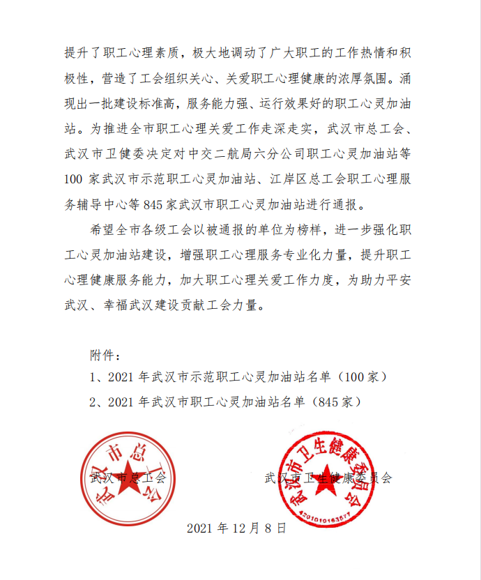 近日,武漢市總工會和武漢市衛(wèi)生健康委員會聯(lián)合發(fā)文通報了2021年度武漢市職工心靈加油站工作情況,產(chǎn)業(yè)園公司榮獲“2021年度武漢市職工心靈加油站”稱號!