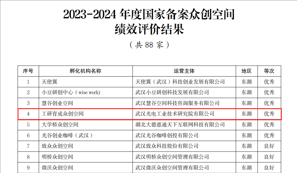 在國(guó)家級(jí)科技企業(yè)孵化器(含7家國(guó)家專業(yè)化眾創(chuàng)空間)績(jī)效評(píng)價(jià)中,武漢光谷生物醫(yī)藥孵化器、武漢光電工研科技企業(yè)孵化器、武漢新能源科技企業(yè)孵化器、光電顯示國(guó)家專業(yè)化眾創(chuàng)空間、智能制造裝備國(guó)家專業(yè)化眾創(chuàng)空間、新能源國(guó)家專業(yè)化眾創(chuàng)空間均獲評(píng)“良好”。