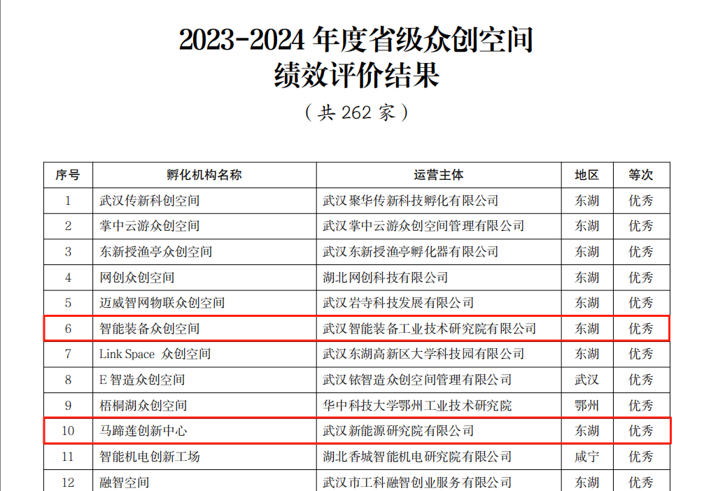 在國(guó)家備案眾創(chuàng)空間績(jī)效評(píng)價(jià)中,光谷產(chǎn)投運(yùn)營(yíng)的“工研育成眾創(chuàng)空間”獲評(píng)“優(yōu)秀”;在省級(jí)眾創(chuàng)空間績(jī)效評(píng)價(jià)中,智裝院運(yùn)營(yíng)的“智能裝備眾創(chuàng)空間”、新能源研究院運(yùn)營(yíng)的“馬蹄蓮創(chuàng)新中心”獲評(píng)“優(yōu)秀”。